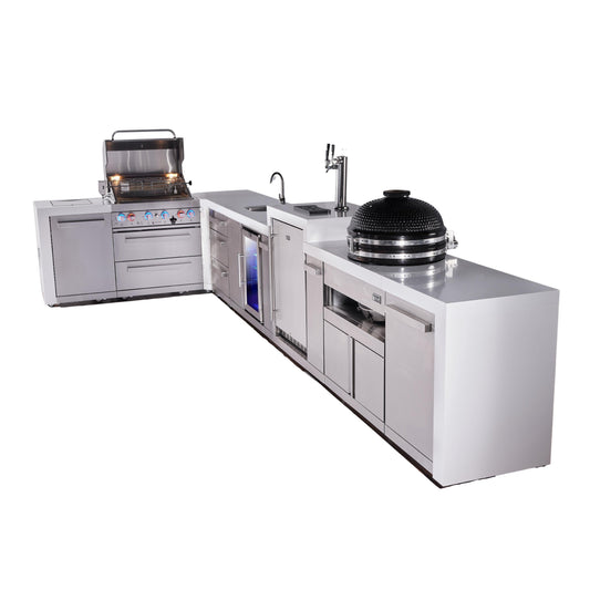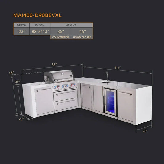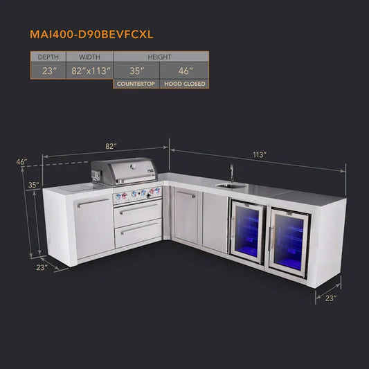 Mont Alpi 400 Deluxe BBQ Grill Island with L-Shape, Beverage Center, Kamado Module & Extra Storage - MAi400-D90BEVKAMXL