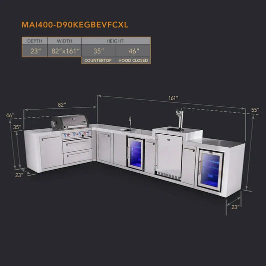 Mont Alpi 400 Deluxe BBQ Grill Island with L-Shape, Beverage Center, Kegerator, Extra Storage & Fridge - MAi400-D90KEGBEVFCXL