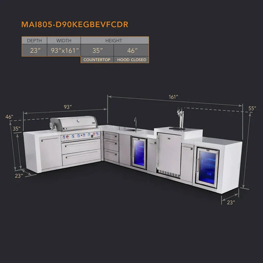 Mont Alpi 805 Deluxe BBQ Grill Island with L-Shape, Beverage Center, Kegerator, Extra Drawer Storage & Fridge - MAi805-D90KEGBEVFCDR
