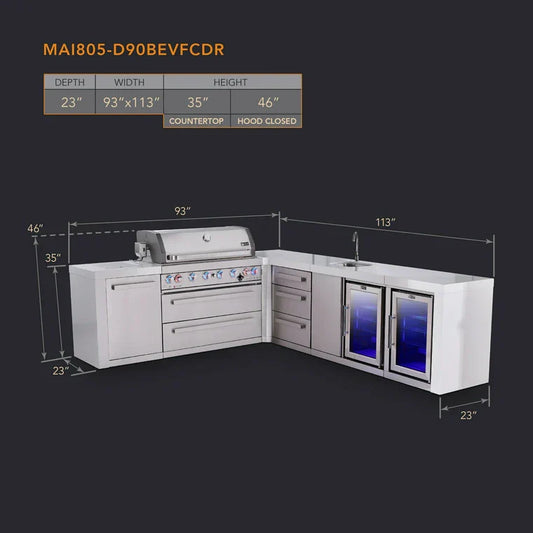 Mont Alpi 805 Deluxe BBQ Grill Island with L-Shape, Beverage Center, Extra Drawer Storage & Fridge - MAi805-D90BEVFCDR