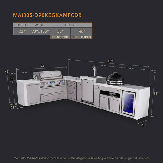Mont Alpi 805 Deluxe BBQ Grill Island with L-Shape, Kegerator, Kamado Module, Extra Drawer Storage & Fridge - MAi805-D90KEGFCKAMDR