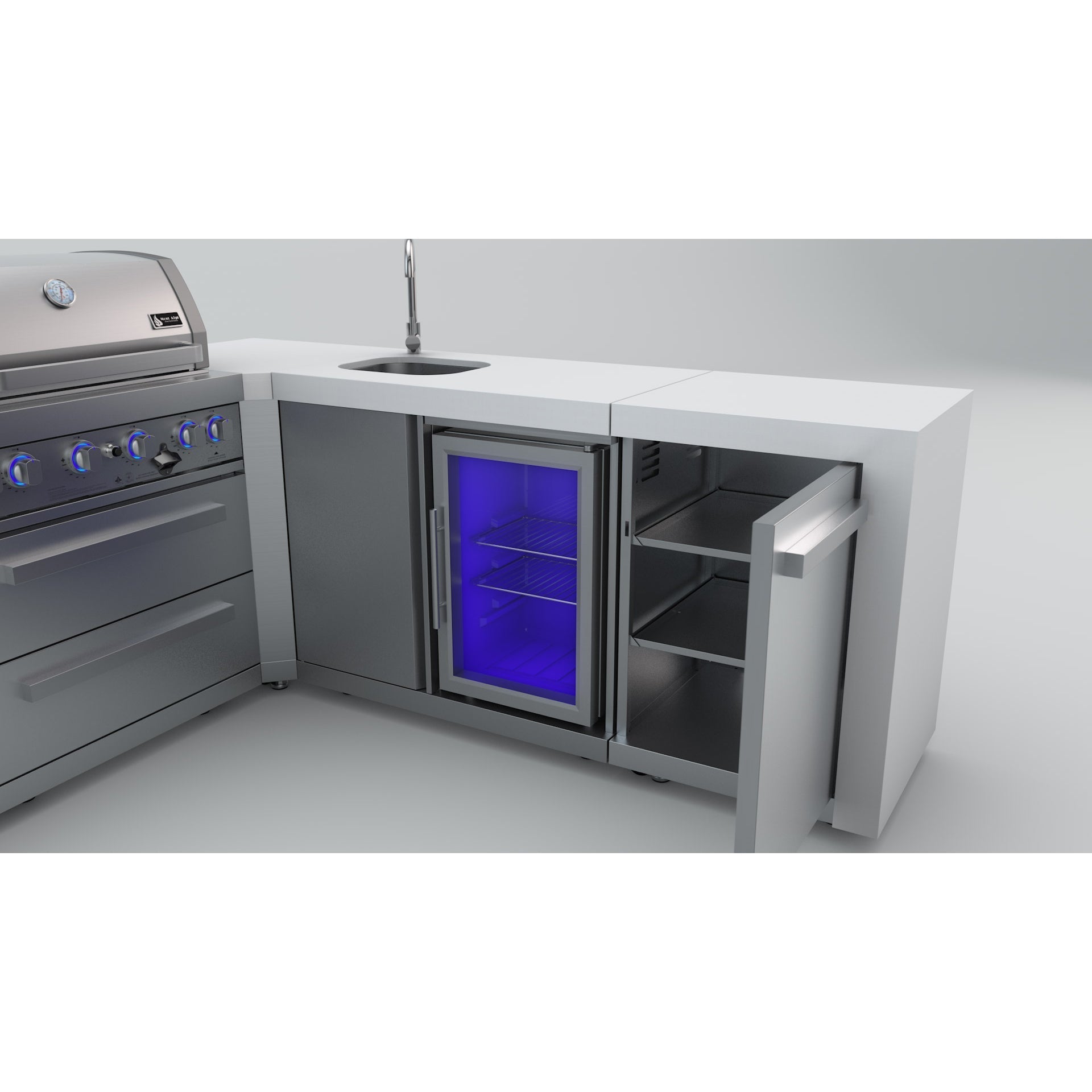 The Mont Alpi MAi400-D90BEV comes equipped with four (4) powerful 304 stainless steel burners, a rotisserie kit, and ceramic infrared rear and side burners. Food prep has never been easier outdoors with the beverage center sink and outdoor rated refrigerator. This L shaped BBQ Island offers unmatched flexibility, whether you’re cooking for family or entertaining guests.