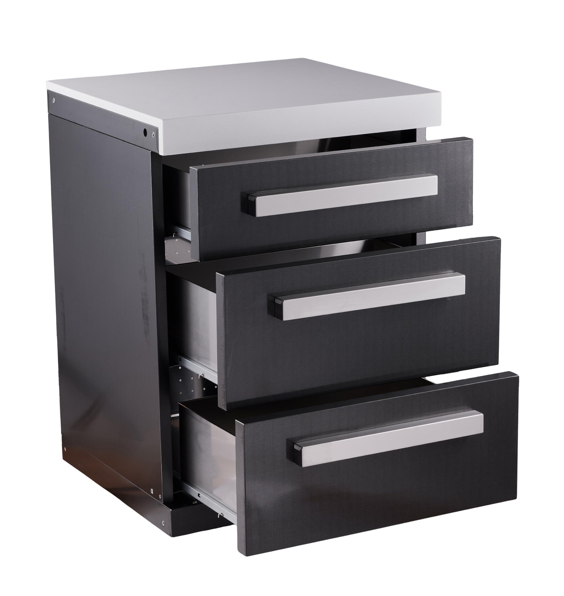 The Mont Alpi Black Series Extra Drawer Slides Cabinet features three smooth-glide drawers constructed from heavy-duty 304 stainless steel, ensuring long-lasting durability and effortless operation. Each drawer offers generous storage capacity, allowing you to keep your outdoor kitchen neat and well-organized during every cookout.