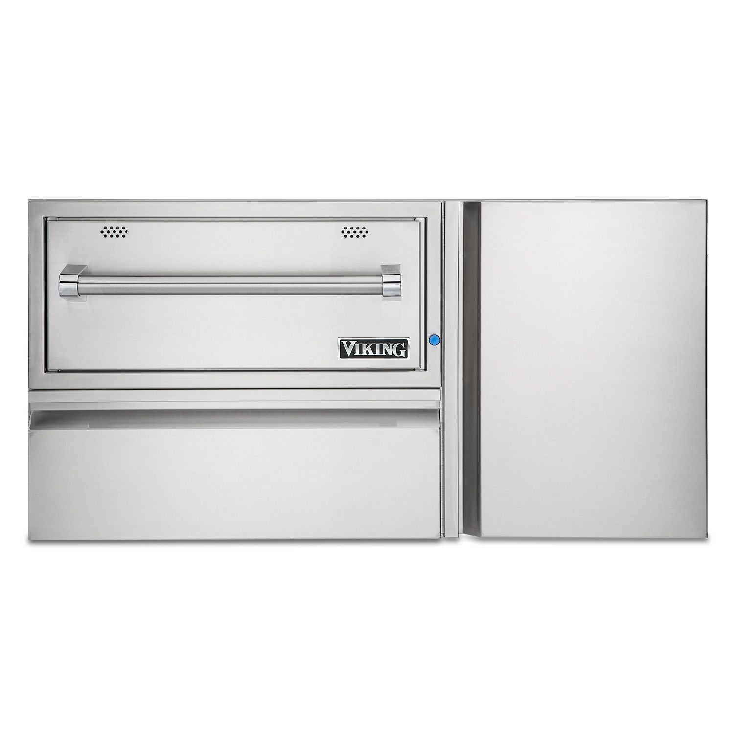 The Viking 5 Series 42-Inch Built-In Warming Drawer features a 30-Inch warming drawer with an LP tank/trash cabinet slide out tray on the side and a utility drawer underneath the warming drawer.